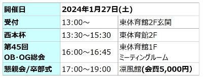 1/29に予定しております西本杯、OB・OG総会、送別会は予定通り実施いたします。